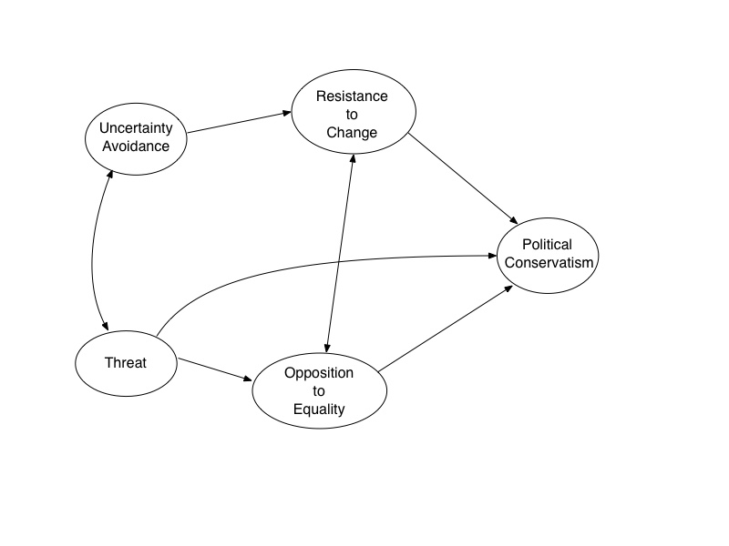 In papers from 2003 and 2007 studies, Jost and his collaborators presented the theory that conservative ideology may be especially attractive to individuals who are permanently or temporarily especially concerned about avoiding threats and managing uncertainty. Those studies resulted in the SEM model (structural equation model) shown in Figure 1. The parameters that go with the arrows have been calculated but aren't shown here because they haven't been standardized. (The numbers may be misleading.)